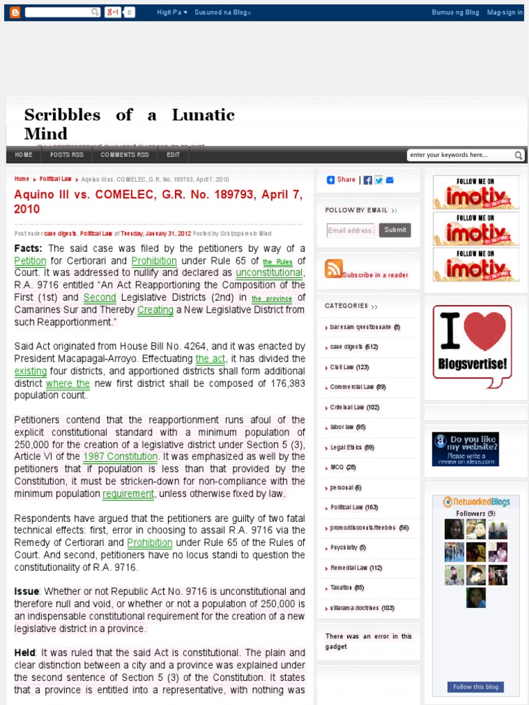 Aquino Iii Vs Comelec G R No 189793 April 7 2010 Apportionment Politics Commission On Elections Philippines