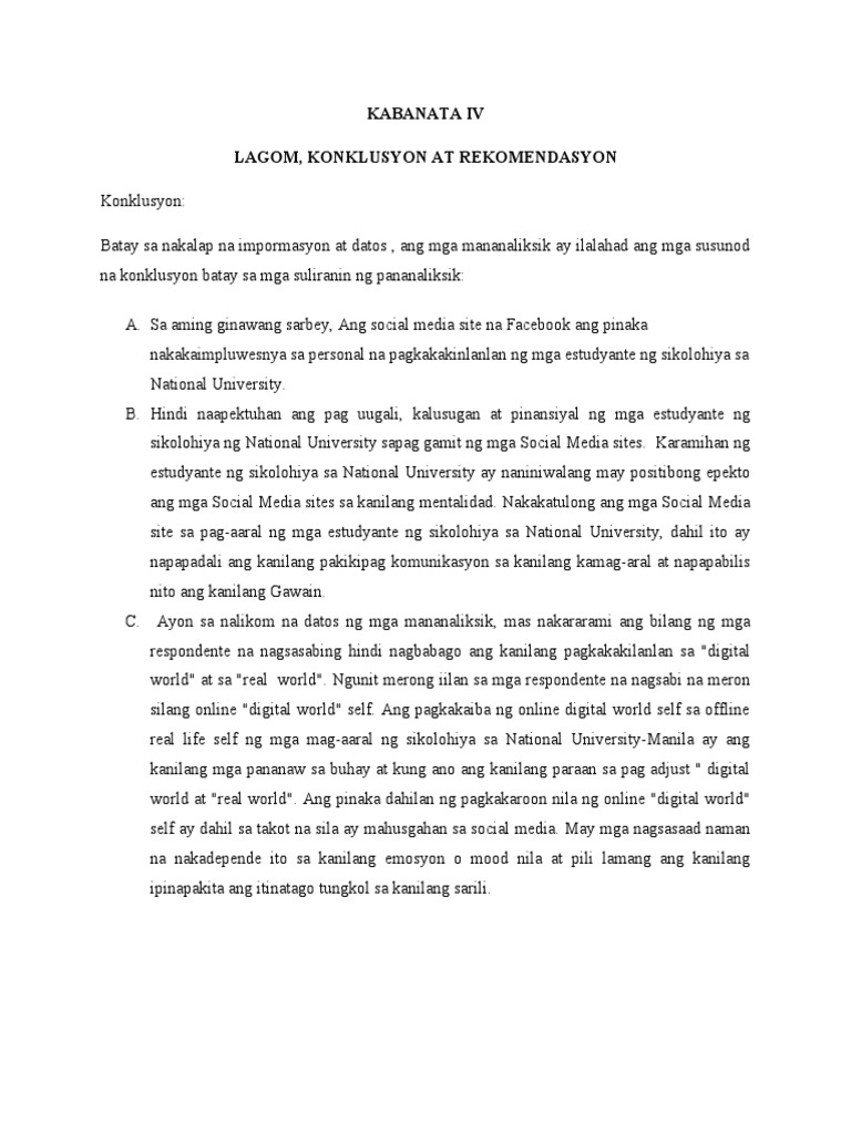 Maaari ding maging rekomendasyon ang mga suhestiyon ng pagpapalawak o pagpapalalim sa susunod na mananaliksik. Malinaw sa mambabasa ang tekstong binasa.